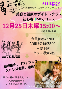 NEWスケジュール 2025.11.22 12月ボイストレーニングクラスご案内 ボイトレクラス開講 12月25日(木)にAORで大月智栄さんをお招きして高酸素室でボイストレーニングを開催します❣ボイストレーニングの効果は腹式呼吸でのリラックスや、顔のリフトアップ等様々な効果があります。誤嚥防止に効果があるのも見逃せません!ボイストレーニングを初めて受ける方が多いので気軽のご参加ください😉予約制ですのでご興味ある方はAORフロントまでお申し込み下さい! お気軽にお問い合わせください! お電話でのお問い合わせも受け付けております!