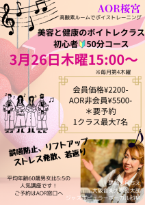 NEWスケジュール 2026.02.25 2026.3月ボイストレーニングクラスご案内 ボイトレクラス開講 2026.3月26日(木)にAORで大月智栄さんをお招きして高酸素室でボイストレーニングを開催します❣ボイストレーニングの効果は腹式呼吸でのリラックスや、顔のリフトアップ等様々な効果があります。誤嚥防止に効果があるのも見逃せません!ボイストレーニングを初めて受ける方が多いので気軽のご参加ください😉予約制ですのでご興味ある方はAORフロントまでお申し込み下さい! お気軽にお問い合わせください! お電話でのお問い合わせも受け付けております!