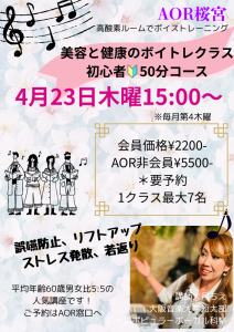 NEWスケジュール 2026.03.16 2026.4月ボイストレーニングクラスご案内 ボイトレクラス開講 2026.4月23日(木)にAORで大月智栄さんをお招きして高酸素室でボイストレーニングを開催します❣ボイストレーニングの効果は腹式呼吸でのリラックスや、顔のリフトアップ等様々な効果があります。誤嚥防止に効果があるのも見逃せません!ボイストレーニングを初めて受ける方が多いので気軽のご参加ください😉予約制ですのでご興味ある方はAORフロントまでお申し込み下さい! お気軽にお問い合わせください! お電話でのお問い合わせも受け付けております!