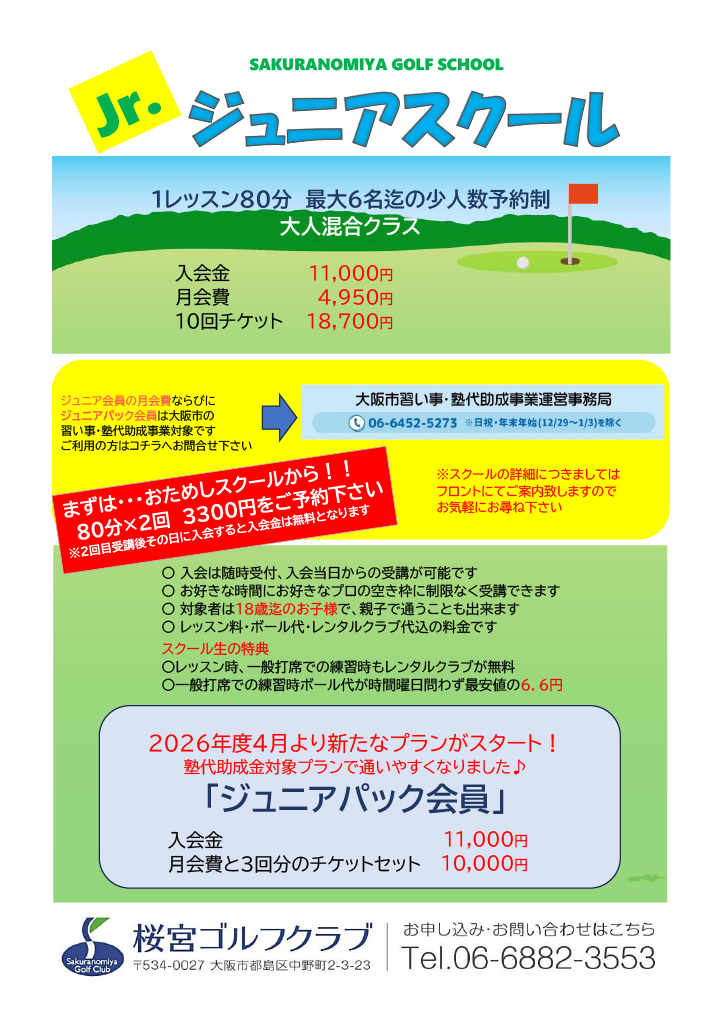 ※レッスン内容・時間割等が異なりますので、お申し込み時は桜宮ゴルフクラブまでお電話ください